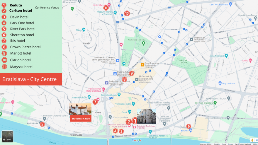 If you are staying at Carlton, Devín, or Park Inn hotels, you should exit tram number 1 at the last stop, which is the eighth one and called Námestie Ľ. Štúra. This stop is very close to all three hotels mentioned. Moreover, the Conference Venue, the Reduta building, is located around 50 meters from this stop.